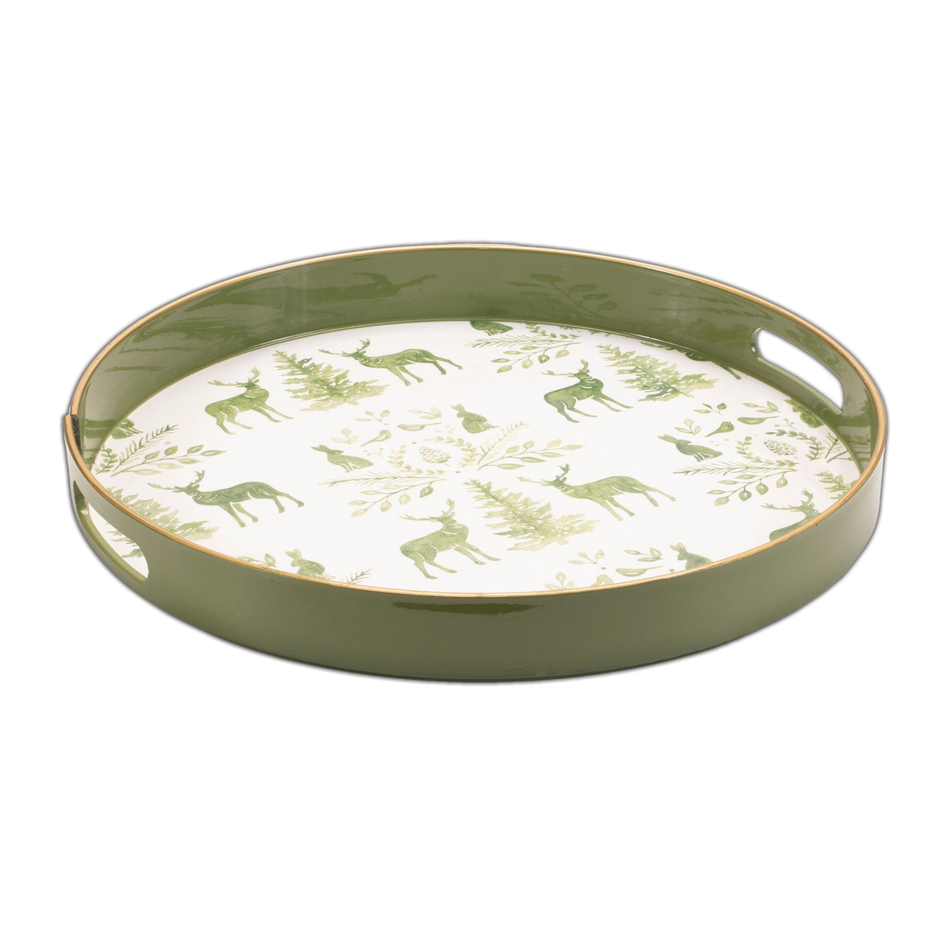 This 14-inch round serving tray features a charming green, white, and gold woodland scene, making it a decorative highlight whether in use or displayed. Crafted from heavy-duty plastic with a painted gold edge, it combines durability with elegant style. Designed with handles for easy transport, this food-safe tray is both practical and visually appealing, perfect for serving guests at parties or gatherings.