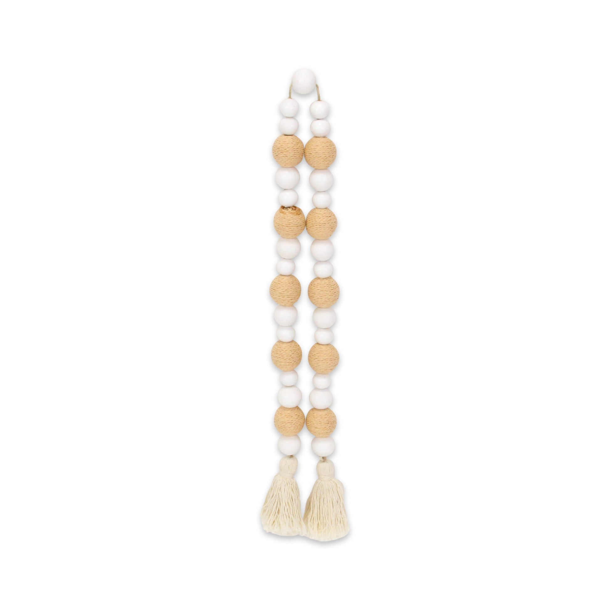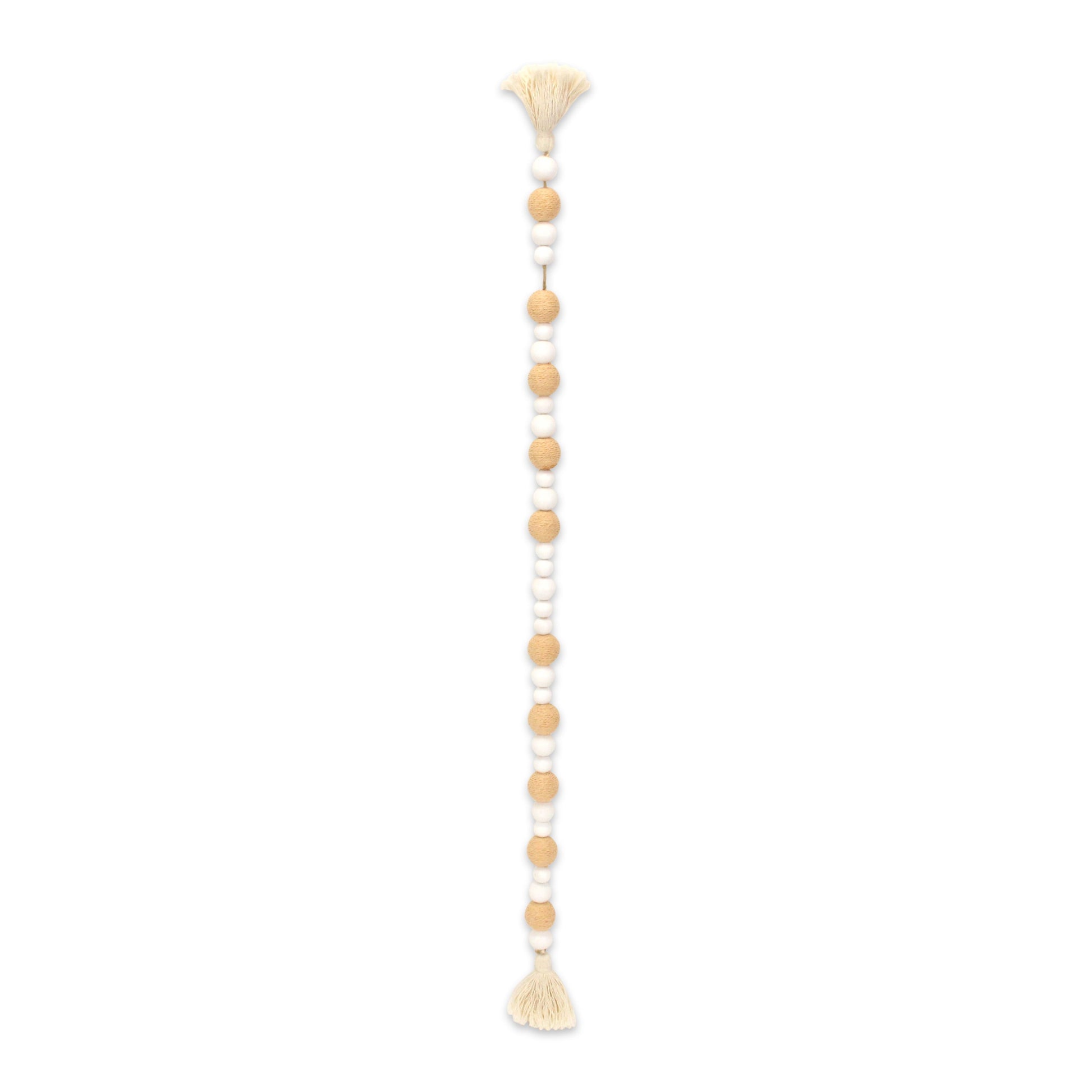 Add an air of fashion to your room and rejuvenate the space with this 38-inch white and natural wood and fabric hand painted decorative tassel. The design and natural coloring of this high quality garland will lend a casual coastal, even Bohemian design sense to your space. This charming and versatile decor can be used as a tabletop decorative accent and can also be hung or strung. It's a perfect addition for those who love an up-to-the-minute look and feel 2.00-inch h x 38.00-inch w x 2.00-inch d.