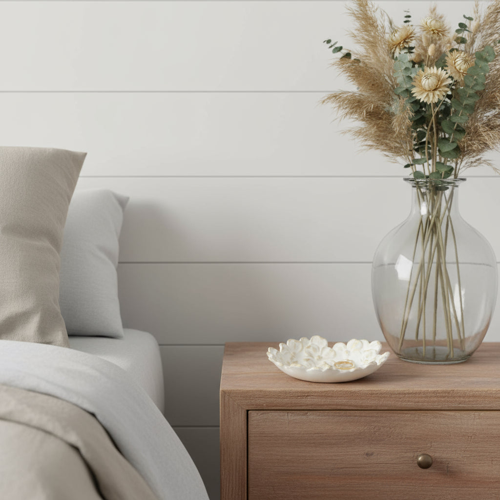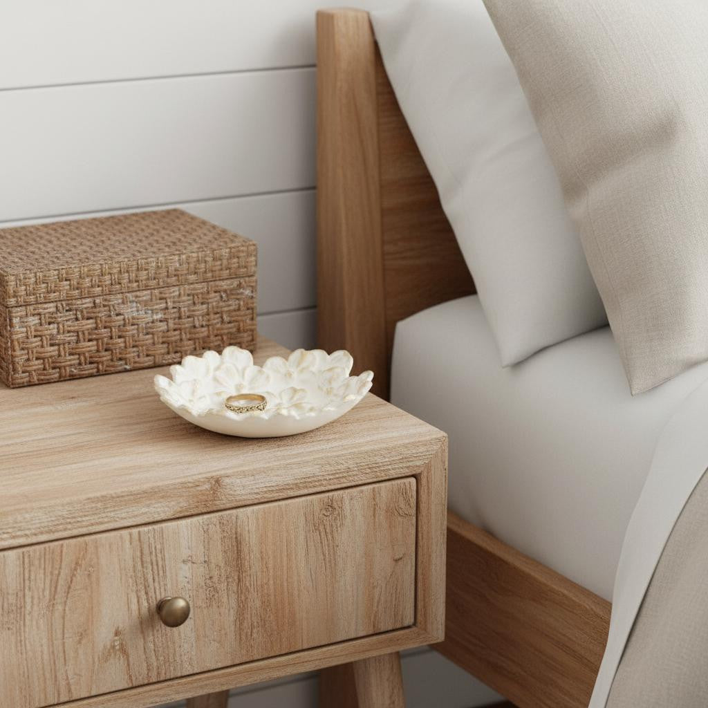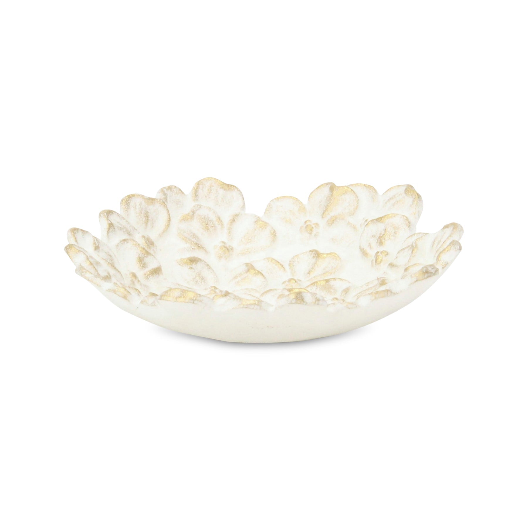Crafted from premium cast iron, this trinket tray showcases a unique dimensional flower shape that adds whimsy to any decor. The modern style is enhanced by a beautiful rustic white with gold brush finish, making it a versatile addition to your home. Each piece is meticulously handmade, ensuring that it is not only functional but also a work of art. The rough hewn distressing gives it a charming, vintage appeal, allowing it to blend seamlessly with both contemporary and traditional interiors. Use it as a stylish catch-all on a tabletop or a lovely addition to your vanity for an inviting look. 1.625-inch h x 7-inch w x 7-inch d.